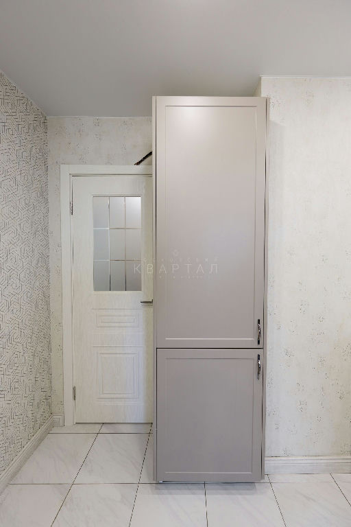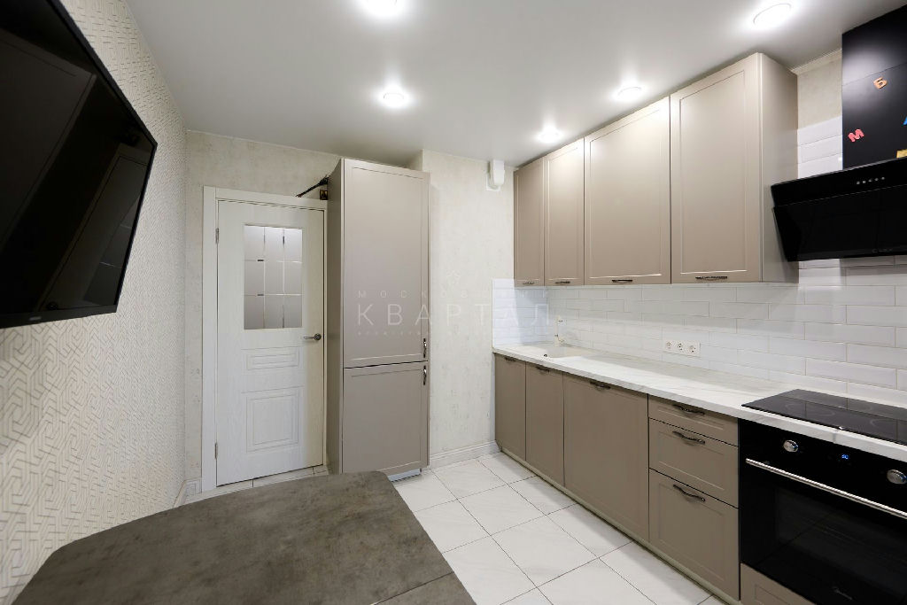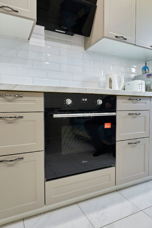 Кухня со встроенной бытовой техникой: варочная панель, холодильник, посудомоечная машина Kuppersberg 60 см, духовой шкаф Midea, вытяжка Lex с выводом в вентиляционный короб.